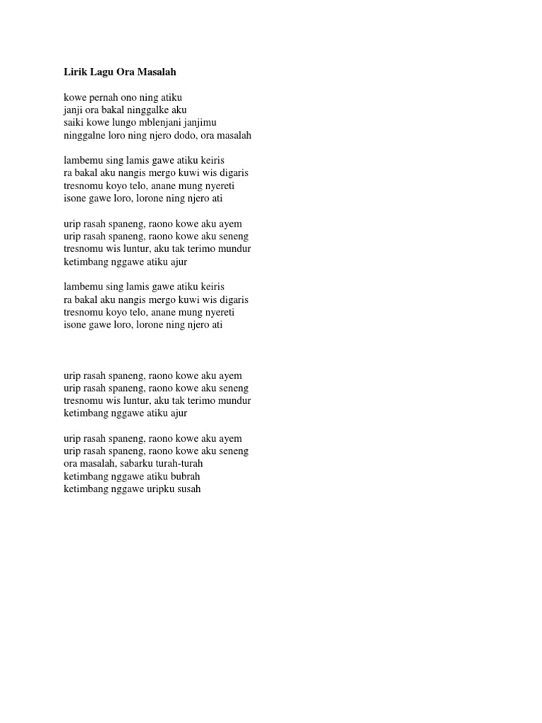 Lirik Dan Terjemahan Lagu Ora Masalah Dan Artinya